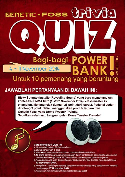 Ricky Sutanto (installer Revealing Sound) yang baru memenangkan kontes SQ EMMA QR2 (1 s/d 2 november 2014), class master 4k champion. Menang telak dengan 25 point dari juara 2. Padahal sudah dipotong 9 point. Beliau menggunakan produk terbaru dari Genetic-Foss, yaitu Dome Tweeter Prelude. Sebutkan salah satu keunggulan dari Dome Tweeter Prelude!